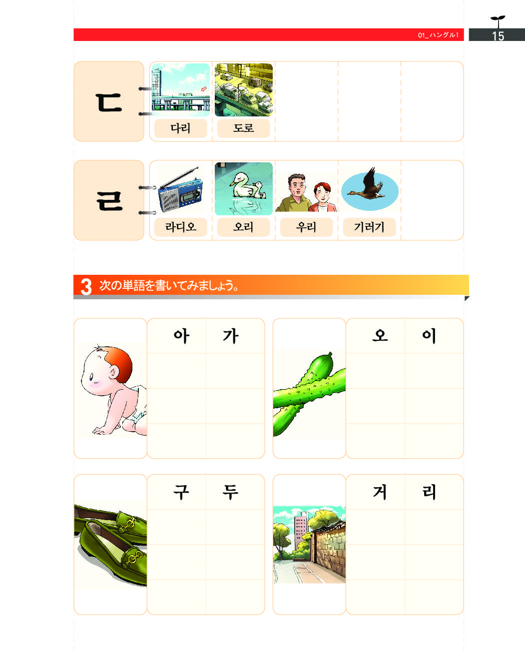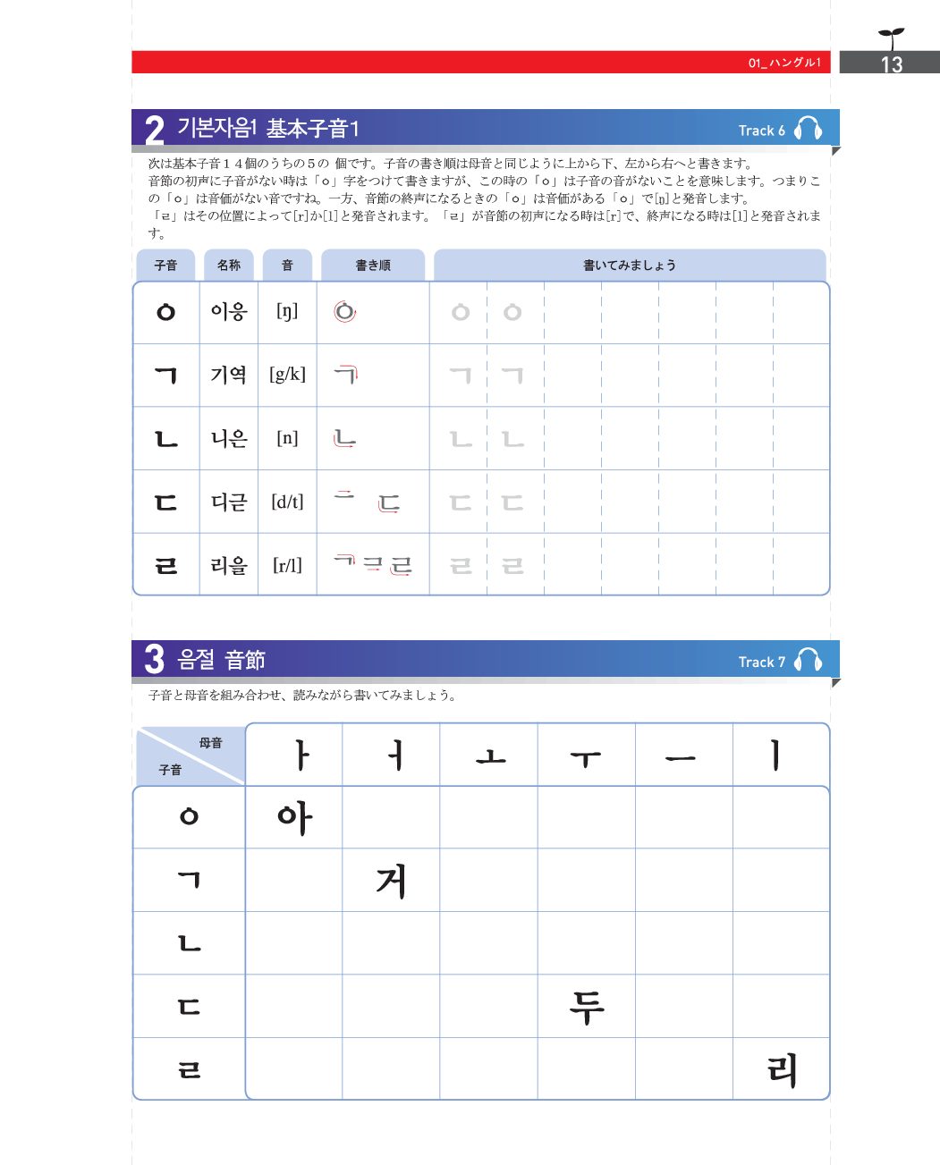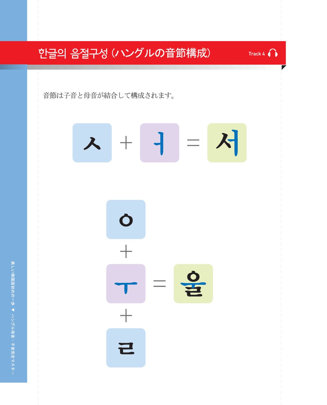 • 第1課〜第4課: ハングルの基礎(基本母音・子音、二重母音、激音・濃音、パッチム)と聞き取り練習